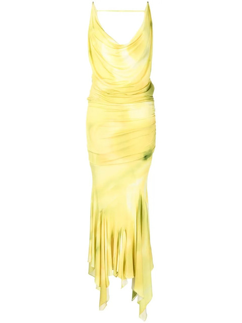 tie-dye ruched dress from The Attico featuring citron pale yellow, tie-dye print, ruched detailing, cowl neck, spaghetti straps, fitted waistline, asymmetric hem and mid-length.