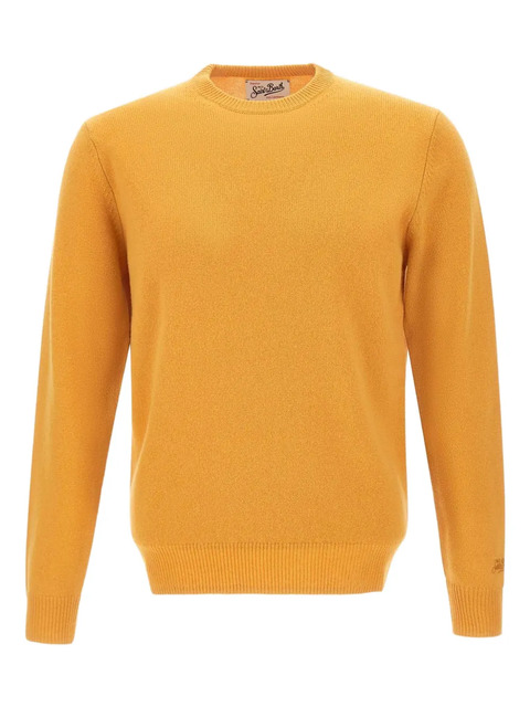 mustard yellow wool crew neck long sleeves ribbed trims embroidered logo on wrist