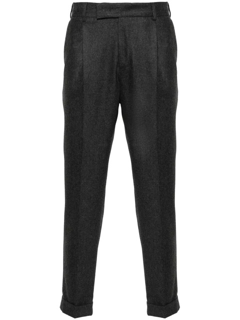 dark grey virgin wool blend flannel mélange effect concealed front fastening mid-rise belt loops pleat detailing pressed crease two side slit pockets two rear flap pockets tapered leg turn-up hem