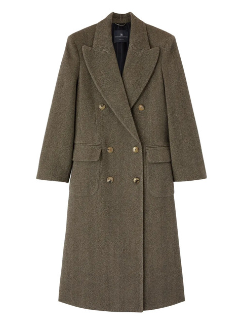 brown herringbone pattern double-breasted button fastening flap pockets belt detail