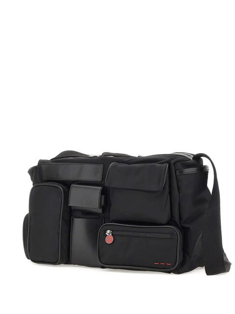 black multiple exterior pockets zip pulls leather inserts zip compartment adjustable shoulder strap