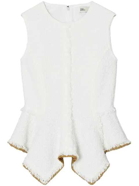 vanilla white stretch-cotton tweed frayed detailing round neck sleeveless handkerchief hem