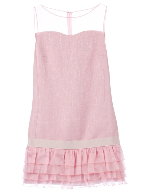 Light pink silk and linen-blend sleeveless dress from Giambattista Valli featuring a boat neck, a sheer panel at the top, a zip to the back and a ruffled hemline.