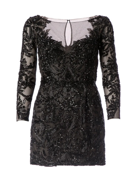 Black silk blend sequin embellished mesh mini dress from Zuhair Murad.