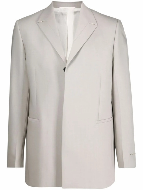 grey logo plaque at the arm dart detailing notched lapels concealed front fastening two front welt pockets long sleeves central rear vent straight hem full lining