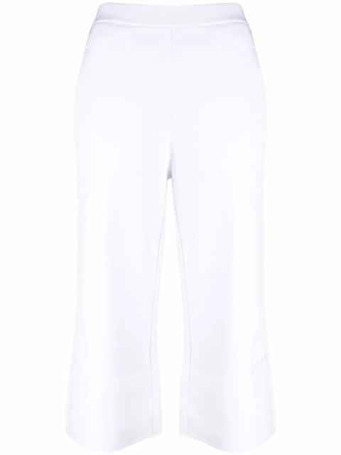 white cotton kick-flare design logo patch to the leg elasticated waistband two side slit pockets cropped leg