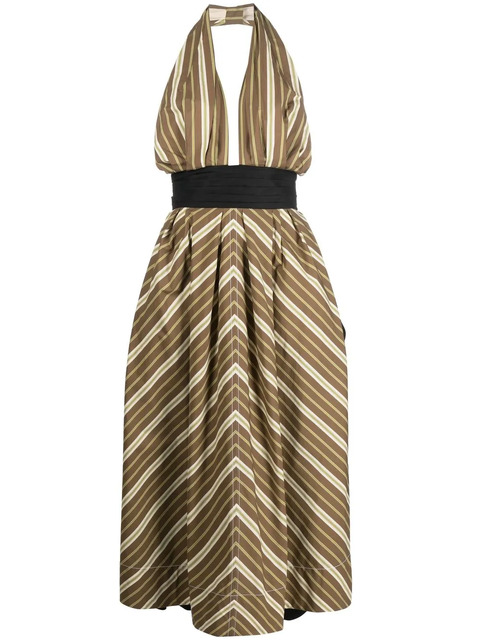 brown/black coffee stripe cotton poplin halterneck backless rear zip fastening A-line ankle-length