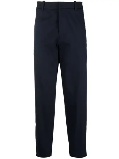 navy blue stretch cotton logo patch to the rear concealed front zip fastening belt loops two side slit pockets two side flap pockets straight leg
