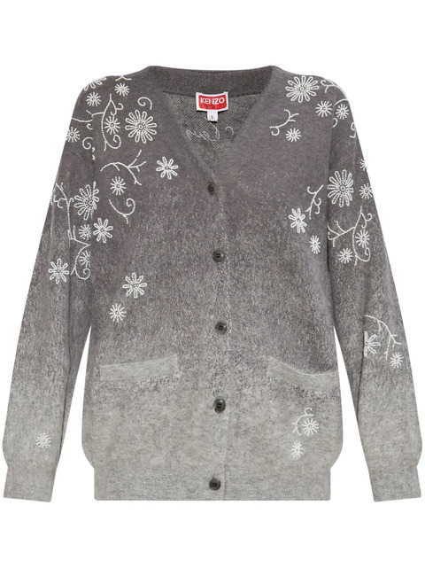 grey alpaca wool-blend ombré effect brushed finish front button fastening V-neck bead embellishment floral motif long sleeves slip pockets to the sides straight hem ribbed cuffs and hem