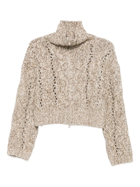 beige cable knit high neck front zip fastening open knit detailing long sleeves