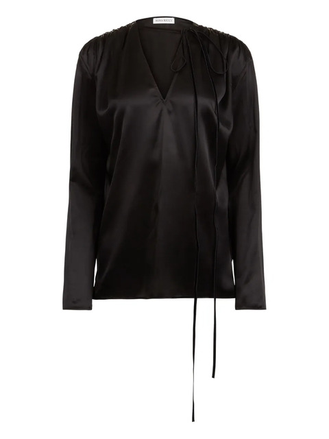 black satin V-neck long sleeves bow detail tie fastening