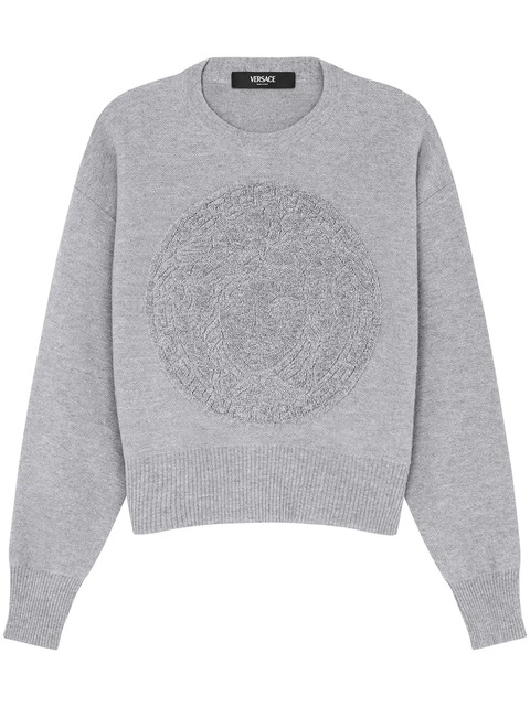 heather grey wool-cashmere blend fine knit ribbed-knit edge mélange effect Medusa Head motif crew neck drop shoulder long sleeves straight hem