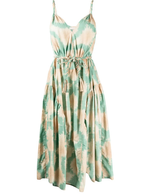 sage green/light orange cotton tie-dye print V-neck twisted shoulder straps sleeveless self-tie fastening below-knee length