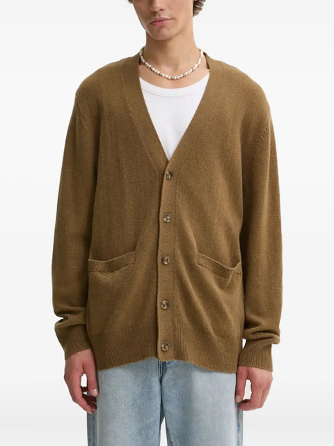 brown v-neck button fastening two front patch pockets ribbed trims