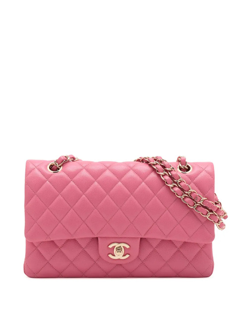quilted caviar leather body leather woven chain straps double front flaps with CC turn-lock closure exterior back slip pocket interior zip and slip pockets.Pink.Serial Number: 30026328.This item has no inclusions.Condition: GOOD. This previously owned and used item is in good condition with minimal signs of use. This may include fading of material or plating and scratches.Due to the exclusivity of this item and its limited availability processing and delivery might take longer than usual.Please refer to the photos on this product page for a detailed view of the item including any damages declared