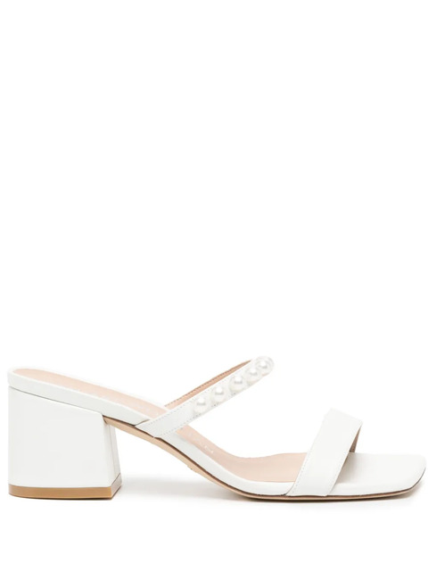 white calf leather faux-pearl embellishment square toe open toe branded leather insole 60mm mid block heel