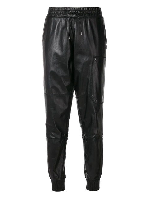 black leather black elasticated waistband two side slit pockets elasticated ankles