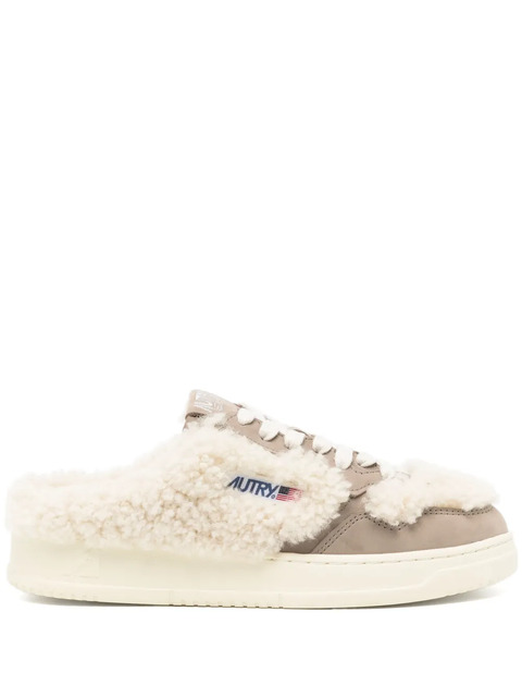 brown/beige lambskin nappa leather shearling panelled design front lace-up fastening slip-on style embroidered logo to the tongue logo patch to the side rubber sole round toe