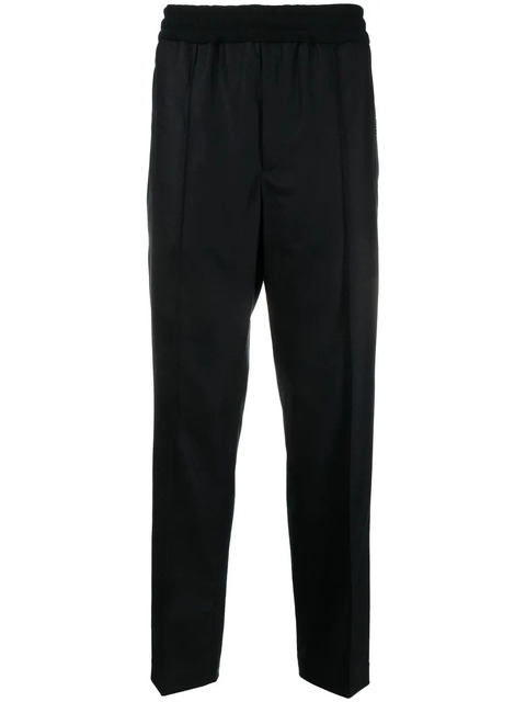 black wool elasticated waistband tonal logo plaque straight leg slim cut two side inset pockets two rear jetted pockets