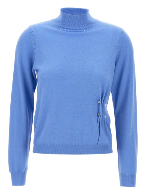 blue gathered detail pearl appliqués high neck long sleeves ribbed edges