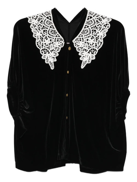 black lace detailing button fastening gathered sleeves velvet effect v-neck