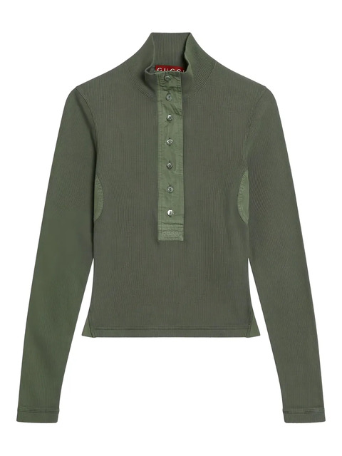 forest green front button placket high neck long sleeves straight hem