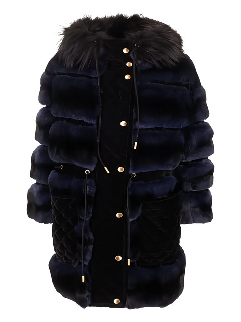 blue fur trim quilted panels button fastening drawstring waist side pockets
