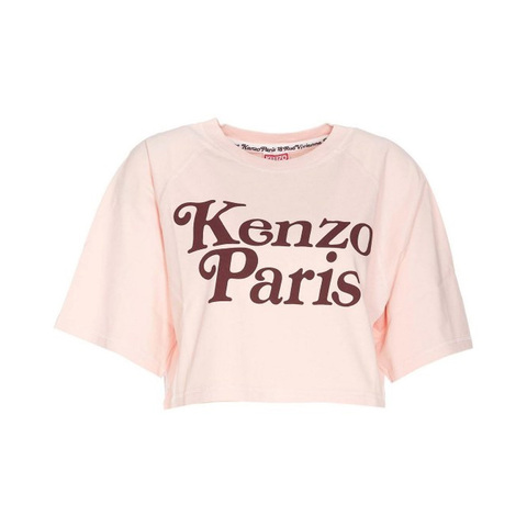 Kenzo Ladies Tops. Fashion category: T-Shirts & Henleys. SKU: FE52TS1104SG-34. Color: Pink. Kenzo x Verdy Logo-Print Cotton T-Shirt. This t-shirt has a cropped, boxy silhouette with short sleeves and a round neckline. it features a 'kenzo paris' logo printed on the front and a unique 'kenzo paris 18 rue vivienne' branded neckband for a distinctive touch. 100% cotton.