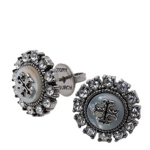 Tory Burch Ladies Earrings. SKU: 87083-020. Color: Antique Pewter/Mop/Crystal. Tory Burch Kira Crystal Stud Earrings The Kira Stud Earrings feature a luminous mother-of-pearl disc, centered with the iconic Tory Burch Double T logo and bordered by delicate milgrain beading. A surrounding halo of crystals adds festive sparkle and elegance. For pierced ears. Push-back post. Nickel-free. Dimensions: Diameter 0.6 in (1.5 cm)