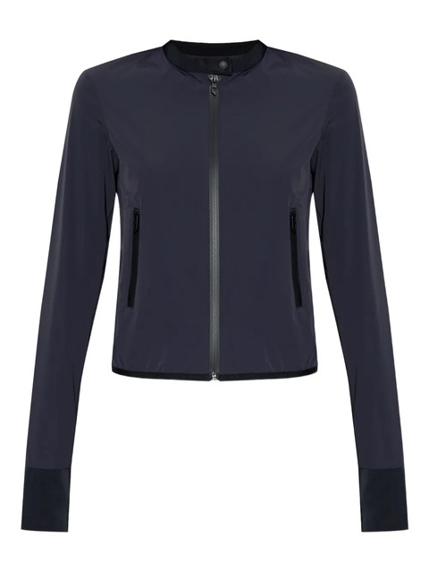 dark blue stand collar zip front fastening long sleeves welt pockets elasticated cuffs