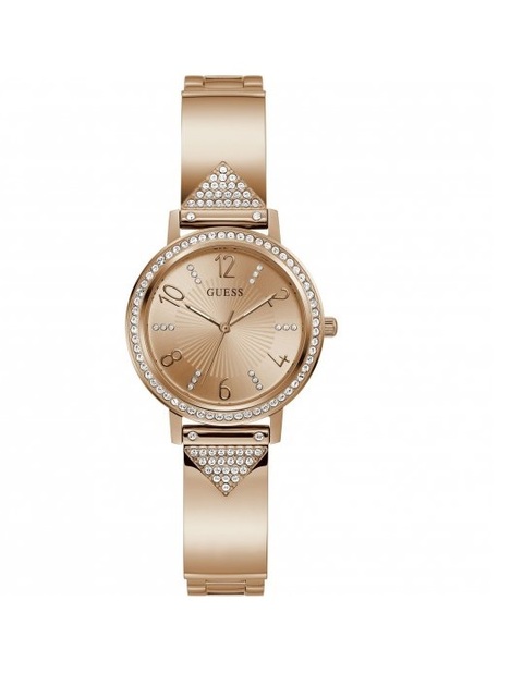 Rose gold-tone stainless steel case and bracelet. Fixed rose gold-tone stainless steel bezel. Rose gold-tone dial with rose gold-tone hands and Arabic numeral hour markers. Dial Type: Analog. Quartz movement. Scratch resistant mineral crystal. Pull / push crown. Round case shape, case size: 32 mm, case thickness: 8 mm. Band width: 9 mm, band length: 7.5 inches. G-link clasp. Water resistant at 30 meters / 100 feet. Functions: hour, minute, second. Tri Luxe Series. Dress watch style. Guess Tri Luxe Rose Gold-tone Dial Ladies Watch GW0474L3.