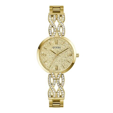 Yellow gold-tone stainless steel case and bracelet. Fixed yellow gold-tone stainless steel bezel. Gold-tone dial with yellow gold-tone hands and index hour markers. Dial Type: Analog. Quartz movement. Scratch resistant mineral crystal. Pull / push crown. Round case shape, case size: 32 mm, case thickness: 8 mm. Band width: 14 mm, band length: 7.5 inches. Fold over clasp. Water resistant at 30 meters / 100 feet. Functions: hour, minute, second. Coral Series. Fashion watch style. Guess Coral Quartz Gold Dial Ladies Watch GW0868L2.