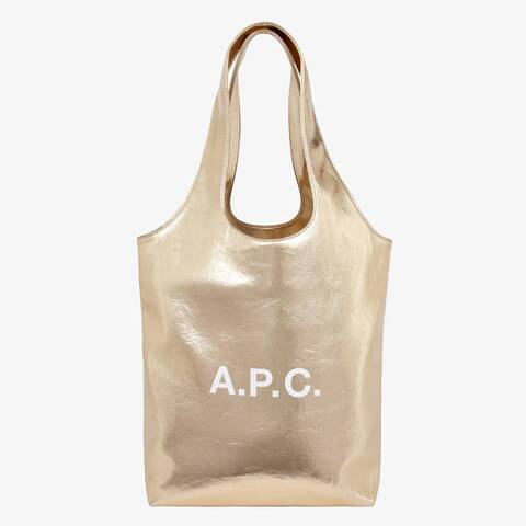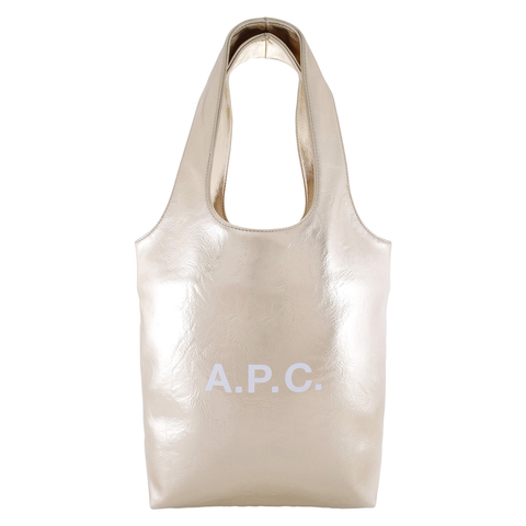 A.P.C. Unisex Tote. SKU: PUABZ-M61861-OR PALE. Color: Goldtone. A.P.C. Ninon Small Tote Bag. The Ninon Small tote bag is a vertical unisex design crafted from goldtone metallised recycled leather-like material. It features two large handles for carrying by hand or on the shoulder, an interior pocket for organization, and a subtle white A.P.C. logo. A compact version of the classic Ninon tote, it combines functionality with minimalist style.Details: Two large handles for hand or shoulder carry.Interior pocket.White logo detail.Dimensions: 13.4 W x 20.9 H x 4.3 D (34 x 53 x 11 cm). Material: Metallised recycled leather-like material.