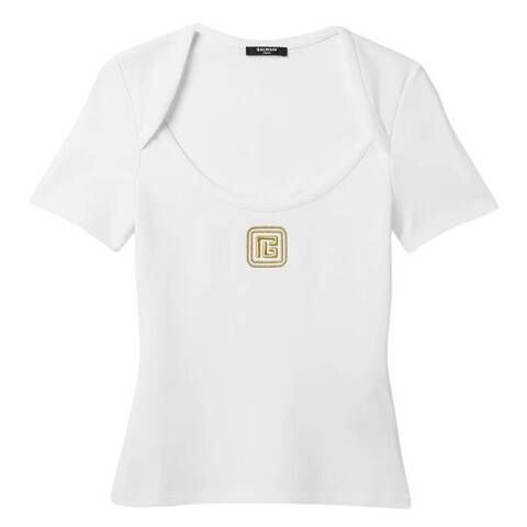 Balmain Ladies Tops. Fashion category: T-Shirts & Henleys. SKU: EF1EF101BC49. Color: Blanc/Or. Balmain PB Logo Embroidered T-Shirt. This fitted T-shirt features a classic round neckline and short sleeves, accented with a textured embroidered PB logo for a subtle, signature detail. 39% Modal, 39% Cotton, 12% Elastane, 10% Polyamide. Made in Portugal.