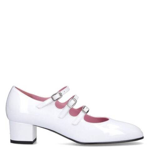 Carel Ladies Heels. SKU: KINA 2-VERNIS BLANC. Carel Kina Patent Leather Mary Jane Pumps. The Kina pumps, crafted from glossy patent leather with a Leather Working Group Silvercertified upper. Handmade in Italy, they feature three adjustable straps adorned with signature Carel logo buckles, ensuring a secure and refined fit. The design rests on a comfortable 4 cm heel and is finished with a leather sole and lining. 100% Leather. Made in Italy. <br/><br/><b>Please visit the brand website for sizing information.</b>