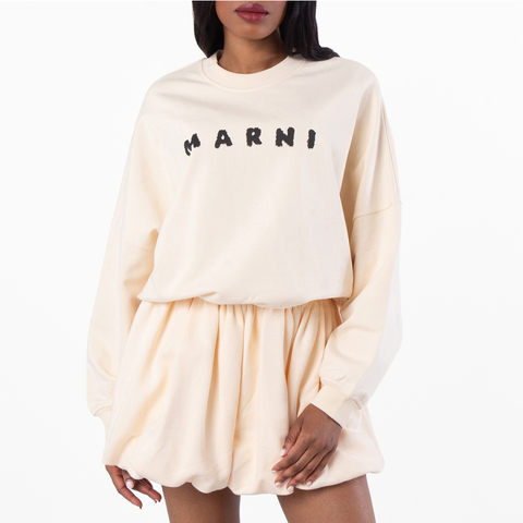 Marni Ladies Tops. Fashion category: Hoodies & Sweatshirts. SKU: FLJE0185P7-IVORY. Color: Ivory. Marni Logo Print Cotton Crewneck Sweatshirt. Crafted from soft jersey cotton and features a bold Marni logo printed across the chest. Designed for a relaxed fit, it includes dropped shoulders and long sleeves for a laid-back silhouette. Ribbed knit trims at the neckline, cuffs, and hem. 100% Cotton Knit. Made in Portugal.