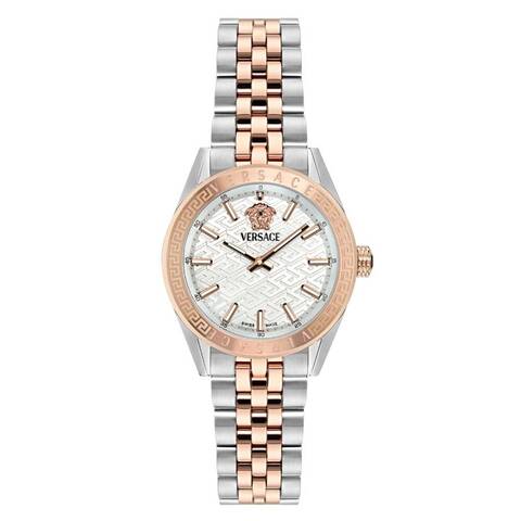 Silver-tone stainless steel case with a two-tone (silver-tone and rose gold-tone) stainless steel bracelet. Fixed rose gold-tone stainless steel bezel. Silver dial with rose gold-tone hands and index hour markers. Minute markers around the outer rim. Dial Type: Analog. Quartz movement. Scratch resistant sapphire crystal. Pull / push crown. Solid case back. Round case shape, case size: 36 mm. Water resistant at 50 meters / 165 feet. Functions: hour, minute. V-code Series. Dress watch style. Watch label: Swiss Made. Versace V-Code Quartz Silver Dial Ladies Watch VE8I00624.