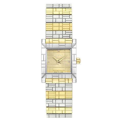 Silver-tone stainless steel case with a two-tone (silver-tone and gold-tone) stainless steel bracelet. Fixed two-tone (silver-tone and gold-tone) stainless steel bezel. Gold-tone dial with gold-tone hands and diamond hour markers. Dial Type: Analog. Quartz movement. Scratch resistant sapphire crystal. Pull / push crown. Solid case back. Rectangle case shape, case size: 22 mm. Deployment with push button release clasp. Water resistant at 30 meters / 100 feet. Functions: hour, minute. Mosaic Series. Dress watch style. Watch label: Swiss Made. Versace Mosaic Quartz Diamond Gold Dial Ladies Watch VE9B00424.