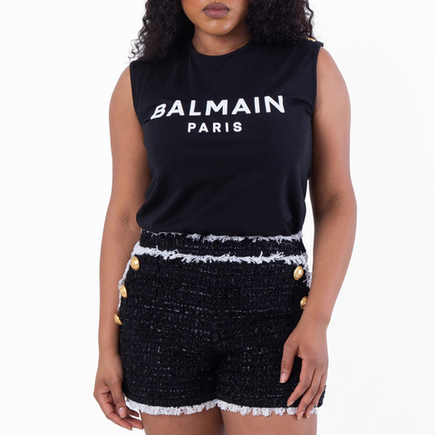 Balmain Ladies Tops. Fashion category: T-Shirts & Henleys. SKU: XF1EB005BB37-EAB. Color: Eab Black/White. Balmain Logo Print Button Embellished Tank top. This shirt features a logo print on the front, button fastening at the shoulder, a round neck, sleeveless design, and a straight hem for a clean, casual look. 100% Cotton. Made in Portugal.