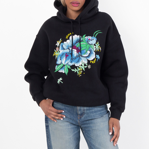 Kenzo Ladies Tops. Fashion category: Hoodies & Sweatshirts. SKU: FF52SW1824MB-99J. Color: Black. Kenzo Peonies Embroidered Oversized Cotton Hoodie. This oversized hoodie showcases the 'Kenzo Peonies' graphic, and is crafted from soft brushed molleton. The front features a vibrant placement print, intricately hand-embroidered with beads and pearls to create a textured, multidimensional effect. The 'Kenzo Paris' logo is seamlessly integrated into the design. 100% Cotton. Made in Portugal.