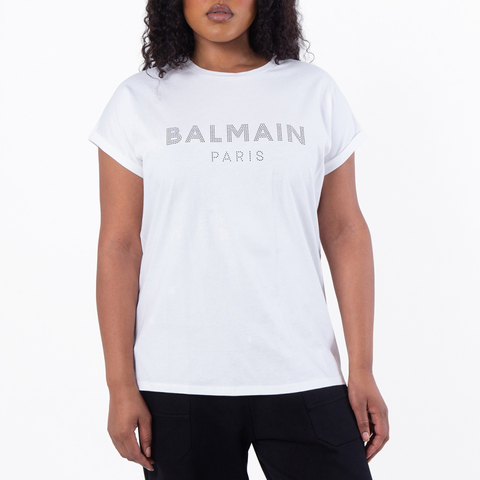 Balmain Ladies Tops. Fashion category: T-Shirts & Henleys. SKU: XF1EF010BB03-GAB. Color: Gab Blanc/Noir. Balmain Strass Logo Cotton T-Shirt. This cotton t-shirt features a classic crewneck and dolman sleeves, finished with a strass-embellished logo on the front for a subtle touch of sparkle. 100% Cotton. Made in Portugal.