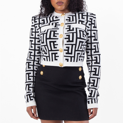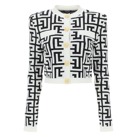 Balmain Ladies Tops. Fashion category: Cardigans & Sweaters. SKU: XF0KL003KB26-EAB. Color: Eab Black/White. Balmain Monogram Kniited Cardigan. This cardigan features a signature PB monogram print, a round neck, embossed gold-tone buttons, shoulder pads, long sleeves, contrasting trim, and a cropped fit. 50% Wool, 30% Viscose, 20% Polyamide. Made in Italy.