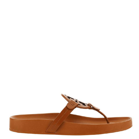 Tory Burch Ladies Sandals. SKU: 81032-202. Color: Bourbon Miele. Vamp Style: Slip-on. Tory Burch Miller Cloud Leather Thong Sandals. These sandals boast a refined one-inch heel for a subtle lift, complemented by a dual-density foam core that offers both exceptional flexibility and responsive rebound. The iconic Tory Burch graphic logo, meticulously laser-cut and finished with hand-painted edges, gently contours to the foot, ensuring a flawless, custom-like fit. Upper Material: Leather. <br/><br/><b>Please visit the brand website for sizing information.</b>