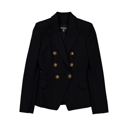 Balmain Ladies Outerwear. Fashion category: Blazers. SKU: UF17110167L-0PA. Color: Black. Balmain Wool Double-Breasted Blazer. Exude sophistication with this Balmain wool double-breasted blazer. Featuring sharp peak lapels, two flap slant pockets, and iconic gold-tone metal logo buttons, its a timeless piece that elevates any wardrobe with structured elegance. Details: Double-breasted. Peak lapels. Two flap slant pockets. Gold-tone metal logo button fastening. Material: Wool.