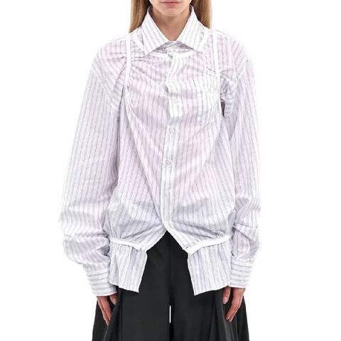 Maison Margiela Ladies Tops. Fashion category: Shirts. SKU: S51DT0019M35280-001F-WHITE/LIGHT BL. Color: White/Light Bl. Maison Margiela Relaxed Fit Cotton Shirt. This shirt showcases a paneled cotton construction with a bold stripe pattern and all-over tank topinspired piping. Featuring ruching and gathering throughout for an asymmetric draped effect, its designed with a spread collar, front button placket, long sleeves with buttoned cuffs, and a shirttail hem. Finished in a relaxed fit for effortless style and movement. 100% Cotton. Made in Italy.