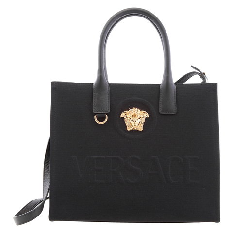 Versace Ladies Tote. SKU: 1005861-1A03095_1B00V. Color: Black/Versace Gold. Versace La Medusa Canvas Small Tote Bag. 100% Cotton