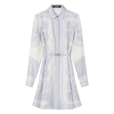 Versace Ladies Dresses. Fashion category: Casual Dresses. SKU: 1018933-1A13359. Color: Silver Grey/Champagne. Versace La Coupe Des Dieux Mini Shirt Dress. This mini shirt dress in twill showcases the La Coupe des Dieux print, featuring Barocco and classical motifs. Designed with a flared skirt and pointed collar, it is finished with a concealed front button placket, buttoned cuffs, and a detachable Medusa '95 belt to accentuate the waist. 100% Silk. Made in Italy.