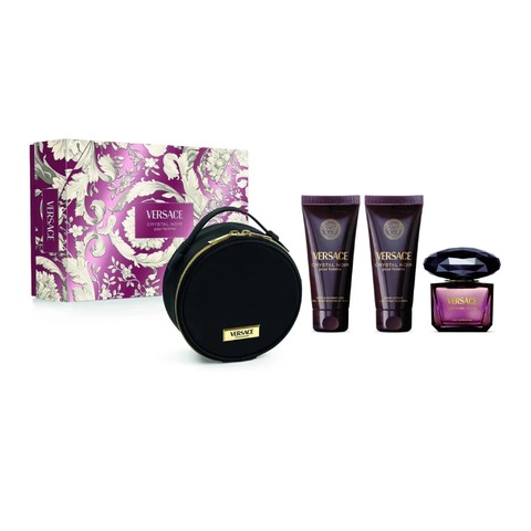 Launch year: 2004. Fragrance Family: Amber Floral. Top notes: Blackcurrant, Black Fig, Violet. Heart notes: Tuberose, Frangipani, Jasmine. Base notes: Sandalwood, Cashmeran, Vanilla Pod, Heliotropine. Design house: Versace. Design house category: fashion. Design house country: Italy. Scent name: Crystal Noir. Gender: Ladies. Category: Fragrance. SubType: Gift Set. Barcode: 8011003902866. Crystal Noir Set Edp90+Bath&Shower Gel100+Body Lotion100+Gwp. Versace Ladies Crystal Noir Gift Set Fragrances 8011003902866. <br/><br/> This item is only valid for shipment in the Contiguous United States & Canada.