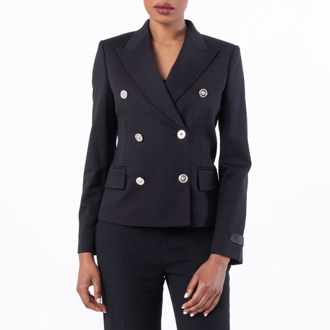 Versace Ladies Outerwear. Fashion category: Blazers. SKU: 1017677-1A12258 1B000. Color: Black. This Versace double-breasted blazer brings structured sophistication with a bold, modern edge. Tailored with a sharp double-breasted silhouette, it features a classic chest welt pocket and two flap pockets at the sides for a timeless look. The addition of a logo patch at the sleeve adds a distinctive touch of house identity, elevating the piece from classic to statement. Ideal for polished daywear or evening refinement, it balances tradition with unmistakable Versace attitude. Outer composition: 98% Pure virgin wool, 2% Elastane. Lining: 100% Cupro. Made in Italy.