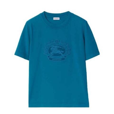 Burberry Ladies Tops. Fashion category: T-Shirts & Henleys. SKU: 8093653. Color: Kingfisher. Burberry Embroidered Logo Cotton T-Shirt. This T-shirt features embroidery with an equestrian knight design, oak leaf badges, and logos, along with a round neck, short sleeves and a straight hem. 100% cotton. Made in Portugal.
